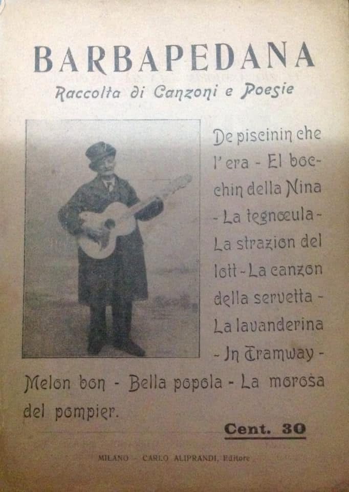 Recentemente in un mercatino di cose vecchie, ho trovato un antico canzoniere autografato, di quelli che il Barbapedana distribuiva nelle osterie dopo le sue esibizioni. Il Barbapedana era di certo il più sincero e spontaneo cantastorie milanese. Girava fiero e spavaldo di osteria in osteria con la sua chitarra, sempre vestito con una vecchia zimarra color marrone intenso e con un cappello a cilindro adorno di un codino di scoiattolo calcato sulla testa. Lo si trovava di solito all’osteria di Loreto dove raccoglieva i suoi memorabili successi. Autentico anticipatore dei cantautori di oggi ironizzava su se stesso con una sua sigla musicale.
