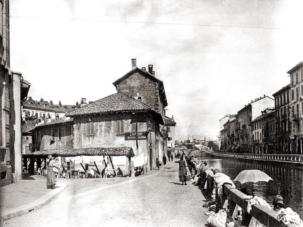 IL “VICOLIN DI LAVANDEE”. Dei molti lavatoi della zona resta soltanto quello dell’ormai famoso “vicolin di lavandee” il primo a destra discendendo dall’Alzaia Naviglio Grande, il Vicolo mantiene ancora intatta l’immagine di una Vecchia Milano sconosciuta a molti dei suoi stessi abitanti. La “gente de la Ripa” come era chiamata esercitava professioni legate in qualche modo alla Darsena, barcaioli, carrettieri, scaricatori di sabbia, ma l’attività prevalente era quella del lavandaio. Il Vicolo dei Lavandai è oggi un luogo incantevole dove con la fantasia si può tornare indietro nel tempo e si può immaginare le lavandaie impegnate nel loro lavoro. Chi esercitava il lavoro erano soprattutto le operaie dei lavandai, un mestiere durissimo, soprattutto in inverno, chine sul “brellín”, una cassetta di legno a tre sponde con impugnatura, che le lavandaie portavano con sé e posavano dietro la “preja”, usata per sbattere la biancheria. In inverno le lavandaie non dimenticavano lo “scaldino” per le mani, un piccolo recipiente di latta riempito con carbone e brace e la “zaína” una bottiglietta capace di un poco di grappa, per difendersi dal gelo. E così in Inverno o in Estate con le artriti, le bronchiti, i geloni alle mani e ai piedi passava la loro vita. Queste donne non possono che richiamare la poesia di Giovanni Pascoli imparata a scuola tanto tempo fa, dal titolo “Lavandare”, appartenente alla prima raccolta, “Myricae”: “E cadenzato dalla gora viene / lo sciabordare delle lavandare / con tonfi spessi e lunghe cantilene….”. Su quella tavola di legno, appoggiata al mastello e pieno di acqua saponata e lisciva, era la consuetudine della “bugada”; (il bucato). In inverno senza un accogliente impianto di riscaldamento con il gelo, o in estate con il caldo torrido questo era l’impegno massacrante delle lavandaie, fatto di mani e di braccia, aveva la possibilità di rigenerare, come nuova, tutta la numerosa biancheria della famiglia. Erano gli impervi e travagliati sentieri del vivere quotidiano.