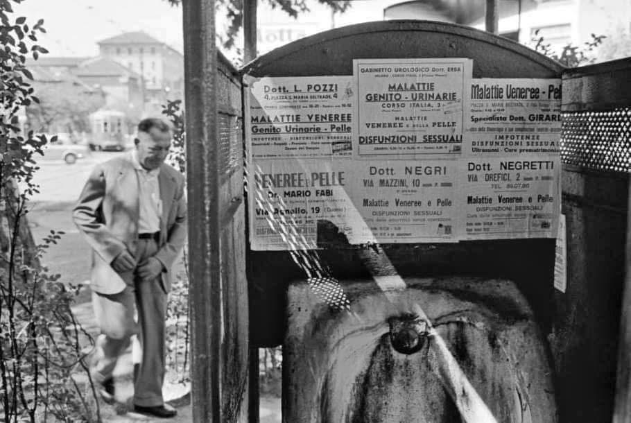 Malgrado il titolo che sembrerebbe evocare una certa nostalgia, niente di tutto questo. I famosi pisciatoi pubblici dalla caratteristica forma di garitta e, col tetto anti pioggia e libertà di accesso sono scomparsi. I cari vecchi vespasiani giardino di delizie dei gay che passavano ore e ore lì vicino aspettando l’occasione propizia a chissà quale facile ricca refurtiva, sono ormai solo un rincordo. Tranquilli i vespasiani non ci sono più, ma ci sono i muri e gli angoli di Milano, diventati ormai cessi per eccellenza. Se ne accorge il sottoscritto quando alla domenica mattina presto si reca al mercatino numismatico, anche nei posti degli espositori esistono strane pozzanghere gialle e maleodoranti, sicuramente non di acqua piovana. Ho un ricordo di quella volta in cui dovetti usarne uno di questi vespasiani tanto tempo fa, mi trovavo a Porta Nuova davanti al Fatebenefratelli, li ne esisteva uno circondato da un piccolo giardinetto, il posto più putrido, maleodorante e degradato che avessi mai visto a Milano. All’interno tutto tappezzato con manifesti pubblicitari di gabinetti medici specializzati in malattie veneree e molti foglietti che non lasciavano dubbi appesi con numeri di telefono e nomi che invitavano ad appuntamenti. L’adescamento si spingeva fin nelle sale cinematografiche dove una particolare fauna provocava spesso, all’improvviso, un fracasso incredibile (dagh al culatton!). Nei primi anni Ottanta i vespasiani divennero un rifugio per i tossici che dovevano iniettarsi la dose quotidiana, vennero così smontati uno dopo l’altro. Oggi esistono in alcune zone di Milano degli orinatoi a pagamento, sporchi da fare schifo definiti “autopulenti”. Non di rado vi si trovano ancora una volta siringhe e aghi nei dintorni.